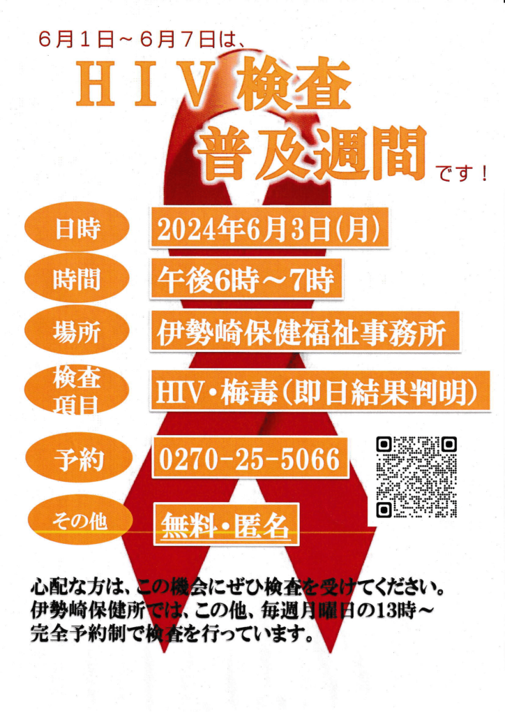 6月1日~7日はHIV検査普及週間について 2024年6月3日 まん中ぐんま元気情報 「6月1日~7日はHIV検査普及週間について」HIV検査のことを広く知っていただく機会として、平成18年に国が定めた「HIV検査普及週間」について、お伝えします。