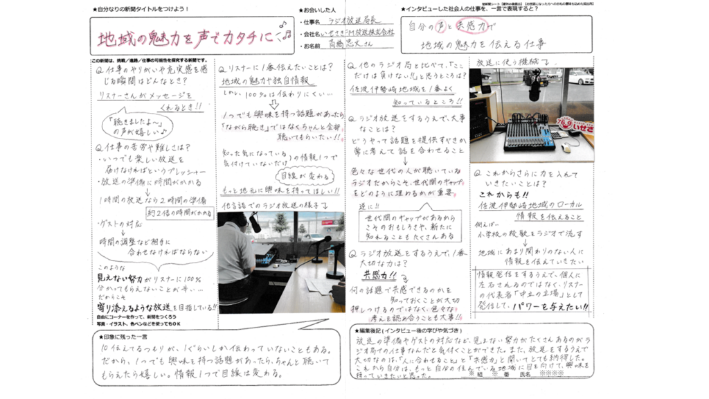 2024.9.12 高校生が校内記事にしてくれました。 2024年9月16日 群馬県立伊勢崎清明高等学校の生徒さんが 「総合的な探求時間」という授業の一環で 「探求インタビュー(インタビュー記事作成)」として弊社の事を校内記事にしてくれました。 「総合的な探求時間」・・・「新たな自分の可能性発見、挑戦する資質・能力をもった生徒」「将来の地域リーダーや地域の根幹を支える人物となりうる資質・能力をもった生徒」を育てる授業